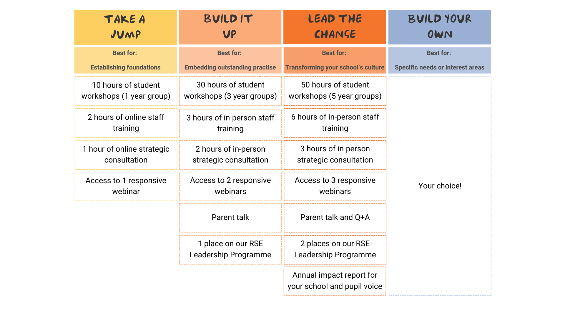 Build your own: Have unique priorities? Use our flexible framework to create a bespoke package of workshops and consultancy.